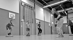 Als de basisbalans goed is, kan het reactievermogen verbeterd worden door sportspecifieke combinaties toe te voegen. Bijvoorbeeld door staand op een Skimmy of Turtle een lichaamsbeweging te maken. Voor balsporters is een actie met een bal en daarna de balans hervinden een uitstekende uitbouwmogelijkheid. Zo speel je in op specifieke situaties en blijf je door gebruik van de bal tijdens de balansoefeningen dicht bij de belevingswereld van de sporter.