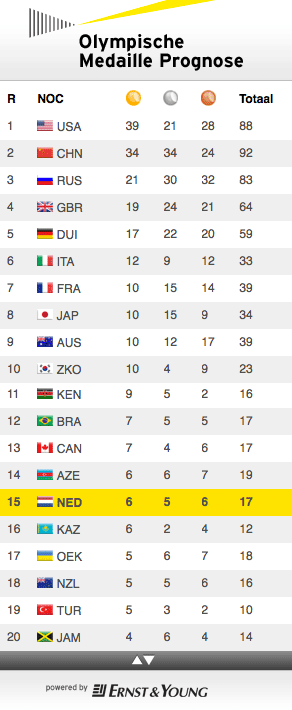 De meest recente prognose (zie de tabel) van Infostrada zou in principe inmiddels veranderd kunnen zijn. Timmermans: “Dat verwacht ik niet. Sinds eind juni zijn er geen sportevenementen geweest die van belang zijn voor onze prognose. Nee, ook het EK Atletiek niet. Dat evenement is te weinig internationaal om zwaar mee te wegen. De goede resultaten van Nederland op de 4x100 meter bij de mannen en de vrouwen hebben dan ook de prognose niet veranderd.”