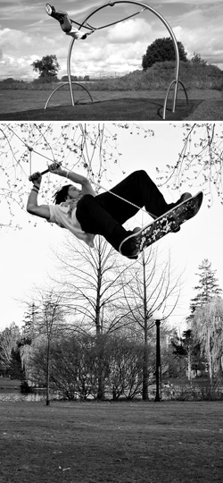 Vier meter hoge schommelDaar werd het opgepikt door Russell Play - een partner van Goede Speelprojecten - die zich toelegde op de ontwikkeling van een toestel dat veilig en zonder bezwaren geplaatst kan worden in de openbare ruimte. Dat werd de vier meter hoge Sky Carver, die wel iets weg heeft van een flinke schommel, inclusief deck om op te staan en touw om in te hangen.