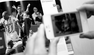 Wat is augmented reality precies? “Aurasma heeft een app die plaatjes, symbolen of objecten herkent en koppelt aan virtuele content”, vertelt Van den Berk. “Het werkt voor gebruikers eigenlijk net als een QR-code, maar dan zijn de codes de plaatjes of de foto’s. Een fan kan bijvoorbeeld een plaatje van het nieuwe uitshirt van PSV scannen met zijn smartphone en dan komt hij direct bij de online PSV FANstore van de club waar hij het shirt kan kopen. Of een fan scant een foto van een clublegende in de presentatiegids en krijgt oude videobeelden met de mooiste doelpunten van die speler te zien. De mogelijkheden zijn eindeloos.” Op dit moment gebruikt PSV de technologie van Aurasma alleen nog in het presentatiemagazine voor het lopende seizoen, maar Van den Berk denkt dat het daar niet bij blijft: “Je kunt ook denken aan het gebruik van deze techniek bij de programmaboekjes rondom de wedstrijden en allerlei andere uitingen. Volgend jaar bestaat PSV honderd jaar en daarvoor zullen we ook weer van alles ontwikkelen.”