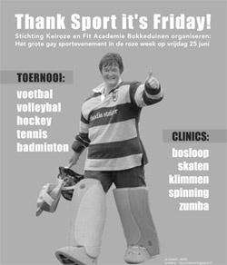Daarom is het volgens haar ook zo belangrijk dat er een groot sportevenement voor homoseksuele sporters wordt gehouden. “Op dat evenement kun je totaal je zelf zijn en ben je voor een keer niet een uitzondering. Voor veel homoseksuelen is dat een verademing.” Het sportevenement dat wordt gehouden aan de vooravond van Roze Zaterdag is georganiseerd in samenwerking met ROC ASA in Amersfoort op de Fit Academie in Bokkeduinen. Vanaf 16.00 uur kunnen sporters meedoen aan het sportevenement. Zo wordt er in toernooiverband voetbal, volleybal, tennis, hockey en badminton georganiseerd. “En daarnaast worden er ook diverse clinics gegevens, zoals zumba, squash, skaten (twintig kilometer door de stad) en klimmen”, vertelt Oudraad.