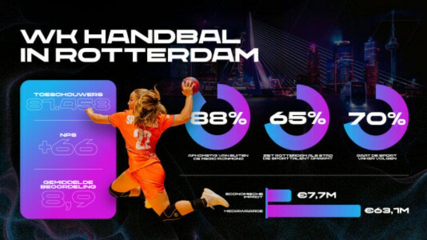 De Nederlandse handbaldames eindigden vorig jaar nipt naast het podium op het WK in eigen land. Ondanks de sportieve teleurstelling werd het evenement in Rotterdam door het publiek hoog gewaardeerd. Dat blijkt uit onderzoek van R2 Research en Cigarbox in opdracht van Rotterdam Topsport en de organisatie van het WK. Het gemiddelde waarderingscijfer onder bezoekers was een 8,9. "Dat is in vergelijking met soortgelijke sportevenementen hoog", vertelt Menno Urbanus van R2 Research.