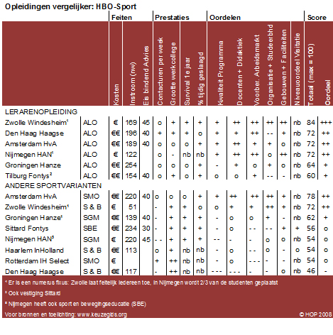 De Keuzegids Hoger Onderwijs 2009 heeft op basis van de oordelen van studenten en experts alle HBO-sportopleidingen in Nederland - zowel lerarenopleidingen als ‘andere sportvarianten’ - onder de loep gelegd. Terwijl experts hun oordeel mochten vellen over het niveau van de opleiding, werd studenten gevraagd iets te zeggen over het studieprogramma, de docenten en de didactiek, loopbaanvoorbereiding, de organisatie van de opleiding en de faciliteiten en gebouwen. Daarnaast is per sportopleiding informatie achterhaald over het aantal contacturen, de groepsgrootte, het percentage studenten dat na het eerste jaar nog ingeschreven staat en het percentage studenten dat na drie (WO) of vier (HBO) jaar het bachelordiploma heeft.
