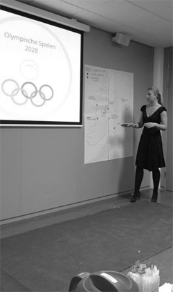 Maar met een goed bidbook alleen komen de studenten er niet. “Alle landen die zich kandideren voor de Olympische Spelen krijgen het voor elkaar om een goed bidbook in elkaar te draaien. Er zijn natuurlijk nog veel meer factoren op basis waarvan IOC-leden hun keuze uiteindelijk baseren”, aldus Tjepkema. “We hebben het lobbycircuit nagebootst met IOC-leden, gespeeld door docenten of mensen uit de Amsterdamse politiek, zoals de voormalige wethouder sport van Osdorp. Net als bij de echte verkiezingen voor de Olympische Spelen, komt er in de managementgame een evaluatiecommissie bij de verschillende kandidaten langs. Na die evaluatie krijgen de teams nog een dag de tijd om hun bidbook aan te passen en op de afsluitende vrijdag presenteren zij hun bid op het nagespeelde IOC-congres. “We hopen met studenten en docenten van de opleiding een congres van 109 IOC-leden bij elkaar te krijgen in het auditorium van de HvA en daar wordt door middel van de geijkte stemprocedure van het IOC de uiteindelijke winnaar gekozen.”