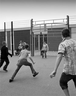 Het schoolplein verandert na schooltijd in een wijkplein, waarvan iedereen gebruik mag maken. Het plein is ingedeeld in vier delen: een Aangepast Cruyff Court, een chillzone, een gedeelte voor de schommels en de sfeertuin. Nijha heeft er niet alleen multifunctionele speeltoestellen neergezet, het verzorgde de hele inrichting. Vedders: “In samenwerking met de Cruyff Foundation hebben we een Aangepast Cruyff Court gerealiseerd, dat helemaal aan de wensen van de kinderen voldoet. Ze kunnen er bijvoorbeeld voetballen en basketballen, maar door de speciale ondergrond en ruimte doorgangen kunnen ze er ook rolstoelhockeyen of –tennissen. De netten zijn verstelbaar, kortom: aan alles is gedacht.” Henk Oostendorp, voormalig regiodirecteur van de Onderwijsspecialisten en initiator van de nieuwe school, had de eer om het court te openen.