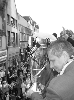 FamilieclubHet echte geheim van Swansea is, naast ‘normaal zakendoen’, het familiegevoel van de club. “In het bestuur zijn we ook gewoon allemaal supporters. Wij juichen net zo hard als het goed gaat en we schelden ook als het minder gaat. Als Swansea verliest, moet je ook echt even niet met me praten, dan ben ik er goed ziek van. Dat supportersgevoel willen we voor iedereen behouden. Na de winst zondag op Wembley hadden we een feest met de spelers en genodigden in het Hilton Hotel tegenover het stadion. Daar stonden supporters voor de deur. Toen hebben we ze de beker gegeven om ermee op de foto te gaan. Noem mij één andere club waar je een uur na de finale als supporter zomaar met de beker op de foto kan. Bij andere clubs staat zo’n beker opgepoetst in een vitrine en mag je er voor veel geld van een afstandje naar kijken.”