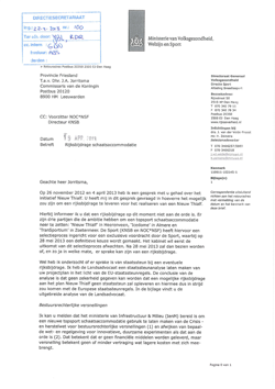 Minister Schippers geeft in deze brief aan dat 'een rijksbijdrage momenteel niet aan de orde is'. Ze wees Jorritsma erop dat niet alleen Thialf maar ook twee andere partijen de ambitie hebben om een topsportaccommodatie te bouwen en dat de KNSB samen met NOC*NSF een selectieproces heeft ingericht om tot een keuze uit die drie gegadigden te komen. 'Het kabinet wil eerst de uitkomst van dit selectieproces afwachten', zo schrijft de minister.