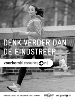 Via ‘Denk verder dan de eindstreep’ geeft VeiligheidNL samen met hardloopwinkelketen Run2Day hardlopers tips en oefeningen mee om op een bewuste manier met hardlopen leren om te gaan. Sinds januari liggen in het kader van de campagne - die dit jaar voor het eerst wordt georganiseerd - flyers en campagnemateriaal in de winkels van Run2Day en geeft het personeel van de hardloopspeciaalzaak klanten proactief tips hoe blessures te voorkomen. Ook wordt er rond de campagne nadrukkelijk verwezen naar de website Voorkomblessures.nl van VeiligheidNL en de speciale ‘Versterk je enkel’-app.