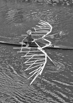 Een mooi idee, maar de uitvoering ervan was zo ingewikkeld dat Rooijakkers de hulp inschakelde van Rogier Scholten van roeivereniging De Hertog. “Ik kan dingen zelf maken, maar vaak zijn ze binnen een minuut of drie kapot. De Enghel moest voor de Bosch Parade minstens drie dagen meegaan. Het werktuigbouwkundige inzicht van Scholten was onontbeerlijk om tot een stevige boot te komen.” Dat lukte wonderwel en de Enghel was twee weken geleden een van de blikvangers van de stoet die door Den Bosch trok. Dat laat onverlet dat het materiaal wel geleden heeft. “De vleugels zijn gemaakt van bamboe. Op het droge lijkt dat heel stevig materiaal, maar water heeft er geen goed effect op. Tijdens de Parade zijn er herstelwerkzaamheden nodig geweest en het zou goed zijn als ik er nog een keer grondig naar kijk.”