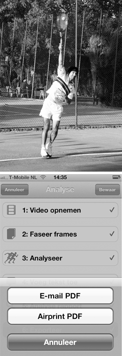 Daarna wordt een analyserapport aangemaakt waaraan tekstvakken bij de bewegingsfases - ingevuld door de app-gebruiker - zijn toegevoegd. De gebruiker kan het rapport vervolgens exporteren naar een pdf-bestand dat weer gemaild kan worden aan bijvoorbeeld fysiotherapeuten of andere experts.