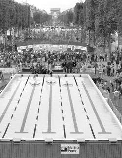 Omdat de baden in korte tijd zijn op te bouwen en af te breken, komen ze vaak uitstekend van pas tijdens evenementen. “Vele handen maken licht werk. In Indianapolis heeft een team in vier dagen een bad geïnstalleerd. Werken er minder mensen mee, dan duurt de installatie uiteraard langer.” Sneller dan The Pool (waarover Sport Knowhow XL hier eerder berichtte) zijn de Myrtha Pools-baden daarmee niet, maar zij zouden kunnen uitgroeien tot een geduchte concurrent. Van Wijnsberge: “Wij stonden al eens met onze kuipen op de Champs-Elysées, op een tennisbaan in Rome, in een sporthal in Istanboel en een atletiekbaan in Wenen. Als we willen, kunnen we overal van pas komen. Water blijft water. Zo moeilijk is het niet.”