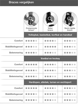 “Sprongsporten, zoals volleybal, basketbal of korfbal zoeken vaak naar een brace die extra steun en stabiliteit geeft,” legt Zuidema uit. “Dan kom je vaak uit bij de veterbrace. Een hockeyer die meer zijwaarts beweegt of een voetballer die ook nog eens de bal schopt, heeft daar minder baat bij en is juist vaak beter af met een compressiebrace met meer bewegingsvrijheid.”