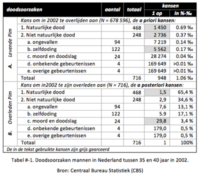 a posteriori kansen gebruiken (Tabel #-1, paneel B). Daarbij tellen alleen de 716 overleden mannen mee. De kans dat Pim een natuurlijke dood stierf is dan 1 op 1,5 (65,4%; Tabel #-1, paneel B, regel 1) en op een onnatuurlijk dood 1 op 2,9 (34,6%; Tabel #-1, paneel B, regel 2). Maar de kans dat Pim overleed door moord is ‘slechts’ 1 op 30 (3,4%; Tabel #-1, paneel B, regel 2c). Ofwel de kans dat Pim als 37-jarige man in 2002 zou zijn vermoord is ongeveer twintig keer kleiner dan dat hij op natuurlijke wijze om het leven kwam. Zelfs de kans dat Pim zelfmoord pleegde is vijf maal groter dan dat hij werd vermoord. Henk werd voor dit deel van de aanklacht honderd procent zeker op foute argumenten veroordeeld.