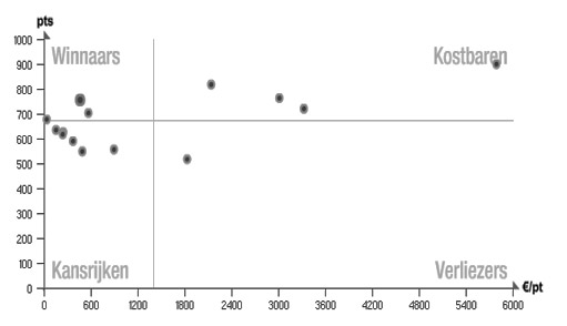 Wat opvalt is dat de sponsorships van ABNAMRO een hoog gemiddeld rendement hebben. Verder zijn er vooral kostbaren en kansrijken, een paar winnaars en gelukkig maar een verliezer.