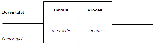 Aan de hand van bovenstaand model worden de verschillende aspecten van communicatie geplaatst, met als conclusie dat we niet praten over wat er onder tafel plaatsvindt, maar dat dat wel 61% van de communicatie inneemt. 5% van de communicatie gaat namelijk over inhoud, 36% van de communicatie heeft betrekking op de intonatie en 59% heeft betrekking op het non-verbale.