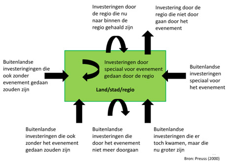 Holger Preuss (NOOT 5) heeft een model ontwikkeld voor het meten van additionele bestedingen. Het blijkt een hele opgave om vast te stellen of een besteding een direct gevolg is van het evenement. Je hebt te maken met mensen die hun vakantie anders gepland hebben (time-switchers), met thuisblijvers speciaal voor het evenement, maar ook met niet-sportliefhebbers die de regio ontvluchten (crowding-out). Hetzelfde principe geld ook voor de investeringen die gedaan worden. Zo wordt altijd geroepen dat een evenement goed is voor de werkgelegenheid, maar deze blijkt vaak weg te lekken naar buitenlandse bedrijven die opdrachten binnenhalen (leakage). Al met al zijn deze onderzoeken zeer complex en is het lastig om tot waterdichte conclusies te komen.
