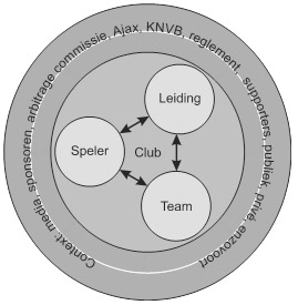 Om inzicht in de sociale interacties binnen betaald voetbalorganisaties te krijgen heb ik een analysemodel (zie figuur hiernaast) uitgewerkt, met drie functionele eenheden: (1) speler, (2) leiding en (3) team. De eenheden zijn functioneel omdat niet de persoon, maar zijn functie bij de analyse de plaats in het model bepaalt. Trainers horen bij het team of bij de leiding. Spelers zijn individu of team. De interacties zijn sociaal omdat ze tussen mensen plaatsvinden. Het model geeft inzicht in de wederkerige interacties tussen de eenheden. Vertrouwen is daarbij cruciaal. Dat bepaalt hoe acties worden geïnterpreteerd en hoe vervolgens wordt gereageerd. Vertrouwen maakt het verschil tussen een positieve en een negatieve actie-reactiespiraal.