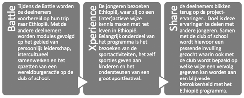 Scholen of verenigingen mogen telkens twee jongeren selecteren die 'op Xperience' gaan naar Ethiopië. De Xperience wordt door de hele vereniging of school gedragen en het is de bedoeling dat zij gedurende langere tijd een bijdrage levert aan mensen met een handicap in Ethiopië en de thema’s wereldburgerschap en internationale samenwerking structureel een plek geven binnen hun club of school. De Ethiopia Xperience bestaat uit drie onderdelen: Battle, Xperience en Share:
