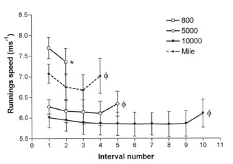 Figuur 1: De snelheid per afstand, waar ‘interval number’ staat voor ronde nummer bij de 800m en de Engelse mijl, en kilometer nummer bij 5.000 en 10.000m (uit: Tucker, Lambert & Noakes, 2006)